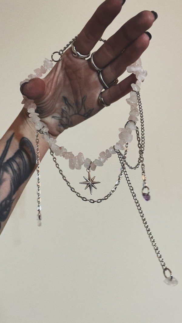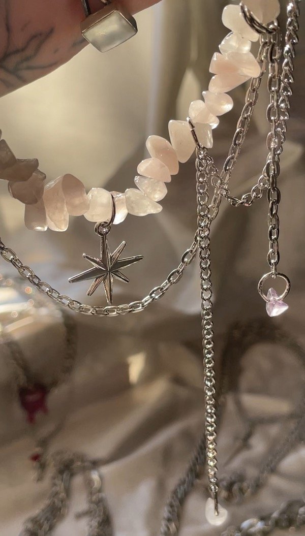 Choker de cristales (piedras preciosas energéticas). Puede ser de cuarzo rosa o amatista o ambas 💘 combinado con finas cadenas, lo más aesthetic que verás hoy ✨