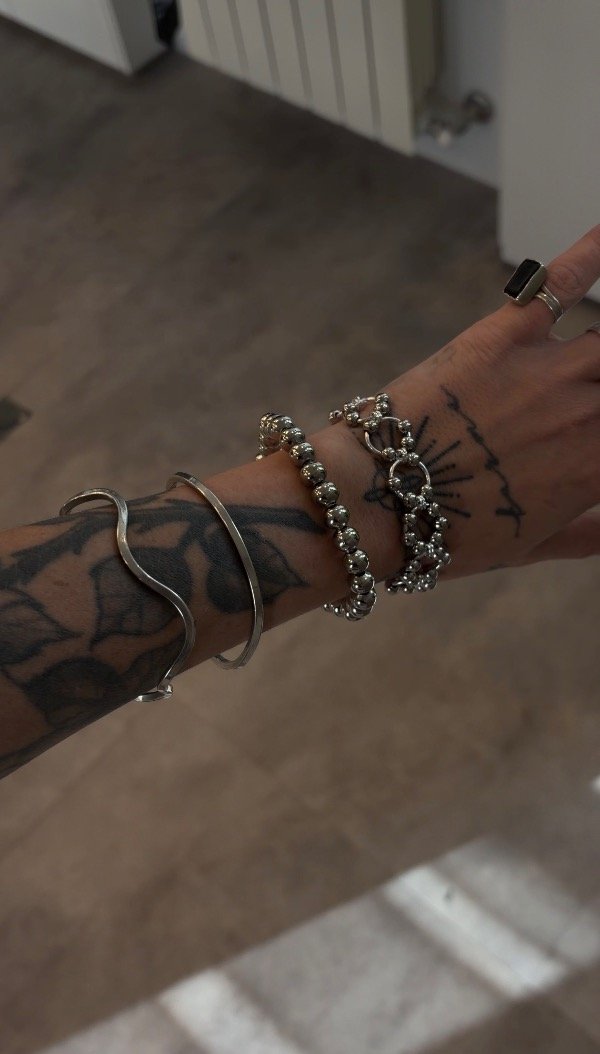 Pulseras de metal, la de perlitas es rígida, la de círculos viene con perlitas en ellos que le dan mucho movimiento. Ideal si sos ansiosa.